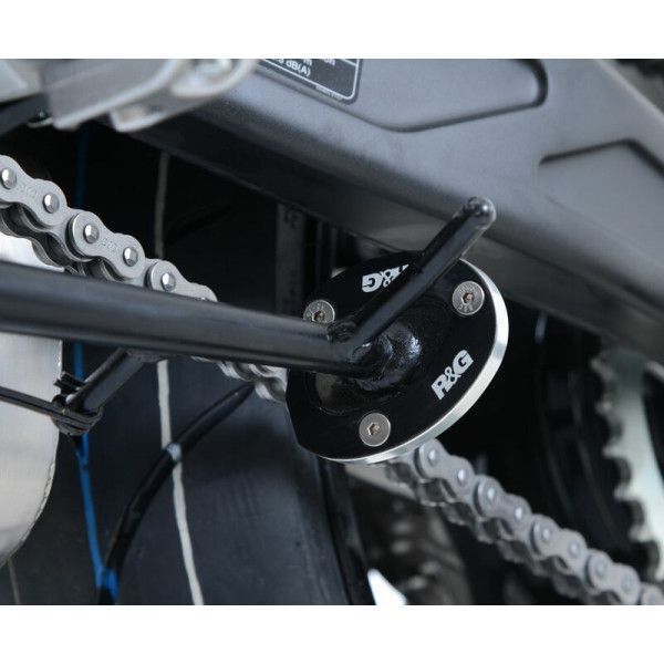 Les patins de béquille R&G Racing se vissent sur votre béquille d’origine et doublent la surface d’appui, pour éviter l’enfoncement dans le sol. Malgré sa taille plus importante, la garde au sol et la ligne de chaine ne sont pas affectées dans des conditions normales de conduite.
