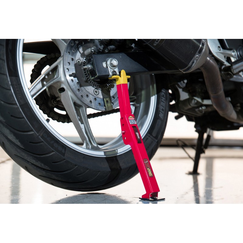 A la maison , comme sur la route vous pouvez emporter partout avec vous la béquille Snap Jack V1 , facile de transport elle vous permettra de n'importe où de graisser votre chaîne ou de nettoyer votre jante.