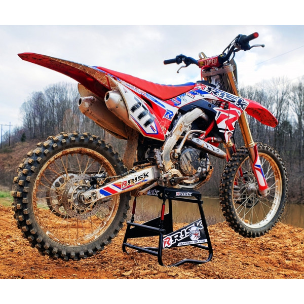 Le lève moto qui met à niveau n'importe quel moto cross ! Le châssis de chaque moto cross est conçu différemment et par conséquent tout les modèles ne sont pas à niveau sur un lève moto traditionnel. Le pneu avant ou arrière touche souvent le sol. Le lève moto Risk Racing résout ce problème.  Caractéristiques :  Partie supérieure complètement ajustablePlaques latérales magnétiques pour accrocher les outilsManivelles en aluminium CNC anodiséPartie supérieure et base surdimensionnées pour plus de stabilitéGrand trou de vidange d'huile au centre de la plaque supérieure