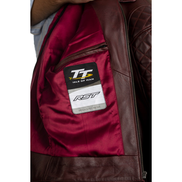 Un blouson au look retro, héritage des courses mythiques de l’Isle of Man TT  Protection Niveau d’homologation CE : AProtection dorsale : Poche uniquementProtection épaules : Niveau CE 1Protection coude : Niveau CE 1  Construction Matière principale externe : Cuir de vachetteDoublure intérieure : Doublure satin fixeCol : CuirManchettes : Cuir rouléZips : Max ZipsFil : Nylon collé (Coates) - Triple coutureZip de raccord : Non  Caractéristiques Poches intérieures : 1Poches extérieures : 2