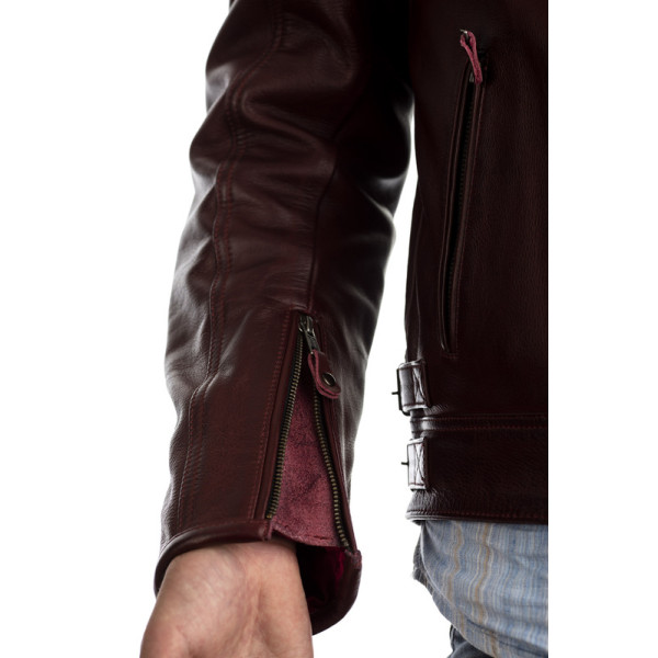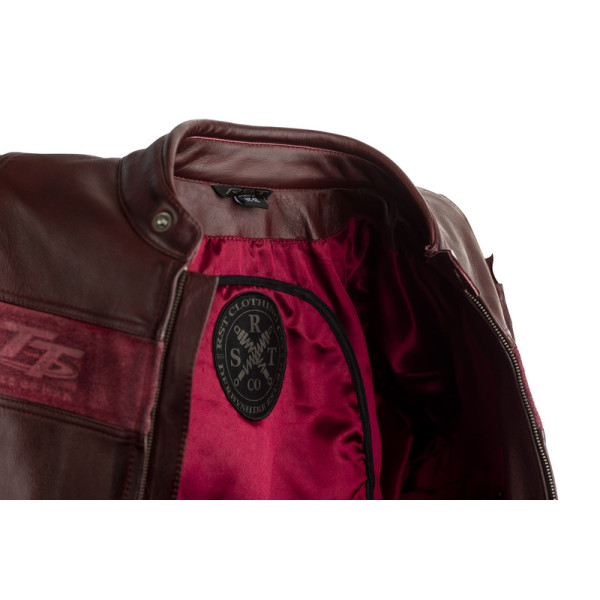 Un blouson au look retro, héritage des courses mythiques de l’Isle of Man TT  Protection Niveau d’homologation CE : AProtection dorsale : Poche uniquementProtection épaules : Niveau CE 1Protection coude : Niveau CE 1  Construction Matière principale externe : Cuir de vachetteDoublure intérieure : Doublure satin fixeCol : CuirManchettes : Cuir rouléZips : Max ZipsFil : Nylon collé (Coates) - Triple coutureZip de raccord : Non  Caractéristiques Poches intérieures : 1Poches extérieures : 2