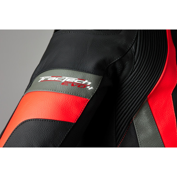 The TracTech Evo 4 leather jacket is part of the two piece version of the TracTech Evo 4 One Piece Suit. Made from cowhide leather, Samtex with stretch leather motion panels and fixed mesh lining, this motorcycle jacket has been cut with a less aggressive stance, making it more comfortable to walk around in. Additionally it offers a superb level of protection: CE certified to Level AAA and CE Level 1 armour fitted in the back, shoulder and elbow. The removable quilted thermal gilet further adds to the versatility of this jacket. The jacket can be easily attached to the TracTech Evo 4 leather jean via the 360° connection zip - making the TracTech Evo 4 a great sports riding combination. ARMOUR CE Certification Rating: AAA Back Protector: CE Level 1 Shoulder Armour: CE Level 1 Elbow Armour: CE Level 1 Shoulder Cup: TPU CONSTRUCTION Main Outer Material: Cowhide Leather Stretch Material: Samtex with Leather Motion Panels Thermal Lining: Removable Quilted Thermal Gilet Inner Lining: Fixed Comfort Mesh Lining Collar: Leather Race Cuff: Rolled Leather Zips: Max Zips Thread: Bonded Nylon - Triple Stitched Ventilation: Perforated Leather Connection Zip: Yes - 360º FEATURES & BENEFITS Hump: Aerodynamic Race Hump