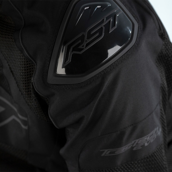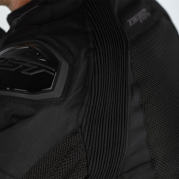 Une veste textile ultra ventilée.  Fabriquée en MaxTex résistant à l’abrasion, la veste comporte aussi une doublure en filet K540 dont le volume des poches d’aération a été quadruplé et qui est cousue pour permettre une circulation optimale de l'air. Elle intègre également du textile tissé extensible dans les 4 sens avec des empiècements d'aisance offrant un niveau de confort accru et une grande liberté de mouvement.  À cela s’ajoutent la membrane imperméable, respirante et amovible en SinAqua et la doublure fixe en filet pour vous garder au sec, avec des systèmes d'ajustement au niveau de la taille et des manches pour un réglage sur mesure.  La veste intègre une poche pour protection dorsale optionnelle et offre une protection homologuée CE Niveau 1 aux épaules et aux coudes ainsi que des empiècements réfléchissants pour encore plus de visibilité et de sécurité.  Le zip de raccord 360° assurera une liaison parfaite avec tous les pantalons RST. Également disponible en version cuir.Homologation CE, AProtection  Protection dorsale : poche uniquementProtection épaule : CE Niveau 1Protection coude : CE Niveau 1 Fabrication  Matière principale externe : MaxTexMatière secondaire externe : filet K540Matière extensible : empiècements d'aisance Doublure imperméable : membrane imperméable amovible en SinAquaDoublure intérieure : doublure fixe en filet Col : néoprène, type SportFermetures éclair MAXFil à âme polyester Zip de raccord : oui - 360° Caractéristiques Réglage : ajusteurs, pour taille et manchesPoches extérieures : 2Poches intérieures : 2Détails réfléchissants : oui - logos et empiècements réfléchissants