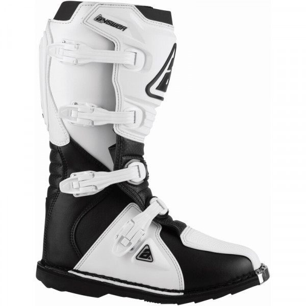 En combinant efficacement matières synthétiques, matières plastiques et textiles hautes performances, Answer a réussi à créer une botte légère, robuste et protectrice. Une semelle 4 couches a été ajoutée et cousue pour garantir une durée de vie maximale à la botte et rendre possible la rénovation de la semelle le moment venu. 4 attaches faciles à ajuster acier/plastique Attaches et sangles remplacables Protège tibia plastique moulé par injection Plaque jambe arrière moulée aide à protéger les os des jambes Zone articulée sur la cheville pour faciliter le mouvement Système de tige acier pour plus de support Semelle uni-directionnelle coupée spécifiquement pour le moto-cross Protection épaisse de la cheville, recouverte d'un matériau respirant Aération par perforations à la pointe du pied pour une meilleure respirabilité