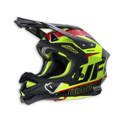 La casque Diamond est le casque le plus innovant et revolutionnaire crée par UFO. Le meilleur de la protection, disposant des meilleures matériaux et technologies pour un maximum de confort. Caratéristiques :  Fabriqué en fibre composite avec un haut pourcentage de carbone (60%)Diamond Concept Shell, la coque éxterieur maximise l'absorbtion et la dissipation des chocsTechnologie RIAS - Rotation Impact Absorbing System, système de protection contre les impacts multidirectionnelsExtensions anti choc, des protections en mousses sont ajoutées à la mentionnière et à l'arrière et la base de la nuqueAjustez facilement la longueur de la visière même en mouvement avec un système d'ajustement exclusifExcellente ventilation du casque qui guarantie une parfaite extraction d'air et dissipation de la chaleurLe casque est entièrement démontable pour un entretien facileCoiffe démontable et lavableSystème d’extraction rapide des mousses ECPRJugulaire doublée avec fermeture double-DFabriqué en Italie