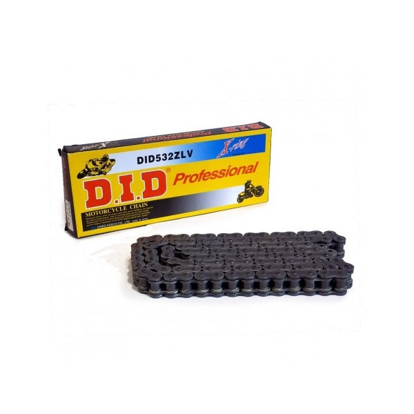 D.I.D est un fabricant japonais d’éléments de transmission haute performance, mondialement reconnu pour la qualité de ses chaînes. Très impliquée en compétition, la marque équipe également de nombreuses machines pour la première monte  Chaîne de type ZLVComposée de maillons X-Ring Mise au point dans le but d’améliorer la résistance aux charges exercées Transfert de puissance vers la roue arrière très précis et sans pertes de puissance Attache à riveterRéférence en termes de fiabilité tout comme de longévité