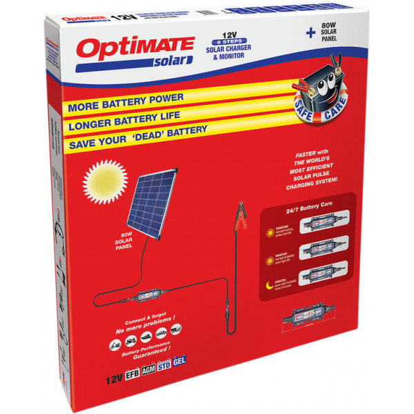 Système de charge et de surveillance OptiMATE Solar 12 V, solution SMART de maintenance des batteries 24 h/24 et 7 j/7 alimentée par le soleil., Le système intelligent OptiMate Solar comprend un panneau solaire résistant aux intempéries de 80 watts et un contrôleur combiné chargeur-moniteur intelligent OptiMate Solar, qui charge et maintient une batterie de 12 V pendant la journée et contrôle et a, La technologie polycristalline à large spectre du panneau solaire génère de l'énergie même en faible lumière, que le contrôleur OptiMate convertit en impulsions de courant élevé plus efficaces pour la charge et la maintenance d'une batterie de 12 V., La nuit, le contrôleur intelligent se transforme en moniteur de batterie, fournissant des informations sur la batterie toutes les 3 secondes sur le panneau à 3 LED facile à lire., Grâce à son action d'impulsion unique, il permet d'économiser les piles plates à partir de 1 V., La charge la plus rapide est délivrée par un contrôle de "charge intelligente" qui sélectionne une charge pulsée ou continue en fonction de l'intensité de la lumière du soleil., La maintenance intelligente se poursuit le lendemain si la batterie a conservé la charge pendant la nuit, sinon le programme revient à l'étape OPTIMISER., L'état de la batterie est affiché toutes les 3 secondes. Indication de disponibilité des batteries STD et AGM haute performance. Utilise moins de 0,5 mA en mode moniteur., Passe automatiquement en mode CHARGE lorsque l'énergie solaire est suffisante., Le contrôleur-chargeur OptiMate est indépendant du panneau solaire et peut être placé à proximité du véhicule ou de la batterie afin de suivre aisément les indications de charge et de maintien de la batterie., Le panneau solaire doit être monté et exposé à la lumière directe du soleil., La portée / distance entre la batterie et le panneau est de 315 cm / 124"., Pour augmenter celle-ci, utilisez les Rallonges de câble OptiMate O-03, O-13 ou O-23 et insérez-les entre le panneau solaire et le contrôleur-chargeur OptiMate., Dimension extérieure, y compris les supports de montage en angle : Largeur = 68,5 cm / 27" Hauteur = 78,1 cm / 30 3/4" Profondeur = 3,3 cm / 1 1/4", Capacité de 80 watt (max.), 12 V nominal, 22 V maximum., Usage extérieur., Cadre en aluminium résistant aux intempéries avec 4 pattes de fixation, câble de sortie 200 cm/80" avec connecteur SAE., Contrôleur chargeur-moniteur OptiMate :, 6,67A à partir du panneau 80W (courant moyen max.), courant d'impulsion 3-5 A, Usage intérieur/extérieur (température minimale : -4 °F/-20 °C)., À partir d'une faible tension de 1V, Idéal pour batteries STD, AGM et GEL de 12 V de 2 à 240 Ah., Entrée 15 – 22 V, Boîtier de contrôleur de charge résistant aux intempéries., Câble de batterie résistant aux intempéries, lot de pinces crocodiles standard et panneau solaire de 80W, Aucun risque de charge excessive. Totalement sûr pour l'électronique du véhicule. Suppression des étincelles. Maintenance longue durée de batterie en toute sécurité. Extinction automatique en cas de court-circuit ou si la batterie est débranchée. Garantie