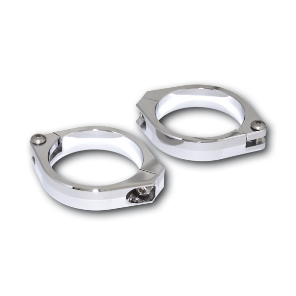 Colliers de serrage HIGHSIDER fabriqués par CNC, colliers en aluminium chromé pour diamètres de tube de 47 mm à 54 mm. La vaste gamme d'accessoires de HIGHSIDER est parfaitement adaptée à votre moto. Avec un maximum de qualité et de fonctionnalité, vous pouvez facilement concevoir votre vélo selon vos souhaits. Dimensions: Dimensions: Diamètre intérieur : 54 mm, avec inserts réductibles à 52 mm, 50 mm, 47 mm ou 49 mm Nombre de pièces : 1 paire Note : Kit support de lampe adapté : Référence 220-619