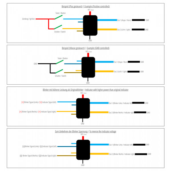 Grâce à ses deux canaux, ce relais peut contrôler deux circuits indépendants et éviter d'endommager les boutons poussoirs en raison du courant élevé. Compatible avec les systèmes de 6V à 14V avec une charge maximale de 40W. Ce relais peut également convertir les entrées de clignotants de masse pulsées en signaux positifs, ce qui est utile pour les motos indiennes.