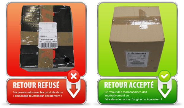 Les articles doivent être retournés dans leur carton d’origine ou un carton similaire si vous n’avez pas conservé votre carton d’origine ou s’il a été détérioré. En aucun cas nous ne pourrons accepter un retour effectué dans le carton du fournisseur, qui ne servent pas au transport de marchandise.