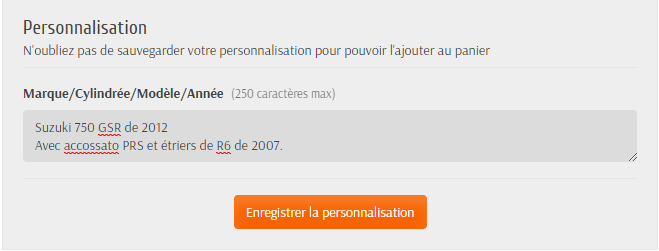 Attention: vous devez absolument remplir les champs "Personnalisation" en indiquant la marque, le modèle et l'année de votre moto. Une fois les champs remplis, cliquez sur enregistrer et ajoutez le produit à votre panier.
