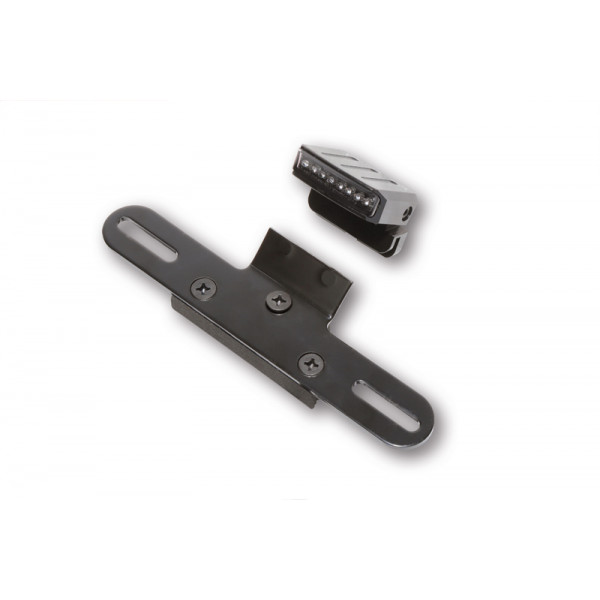 HIGHSIDER smart MOVE Type 2 Combinaison universelle de feu arrière à LED et de support de plaque d'immatriculation. Caractéristiques Feu arrière Feu arrière Feu stop Feu de plaque d'immatriculation Boîtier métallique noir Verre teinté Amovible Homologué E Dimensions Feu arrière Largeur : 47 mm Hauteur : 15 mm Profondeur : 43 mm Support de plaque d'immatriculation Largeur : 178 mm Hauteur : 27 mm Épaisseur : 2 mm Hauteur du bord inférieur du support de plaque jusqu'au bord supérieur du feu arrière : environ 71 mm (selon l'angle d'installation) Technique Noir = masse (-) Jaune = feu arrière (+) Rouge = feu stop (+) Contenu de la livraison : 1 pièce