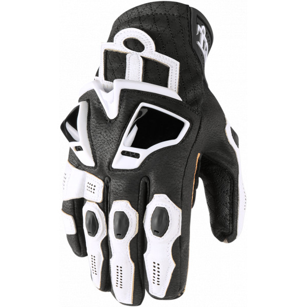 Le dos de la main en cuir de vache français est souple, solide et offre d’excellentes qualités de confort et de flexibilité, La paume en cuir de kangourou (une marque de fabrique pour les gants spécialement conçus pour la piste) offre une dextérité et une résistance à l’abrasion optimale, Des inserts en cuir de chèvre Battlehide™ sont placés sur les zones à risque d’abrasion par les poignées, Empiècements à articulation mécanique le long chaque doigt pour une flexibilité excellente du gant dès le premier instant, L’articulation flottante exclusive ICON autorise un mouvement articulaire maximal et les coutures extérieures au niveau des doigts assurent un confort durable tout au long de la journée.