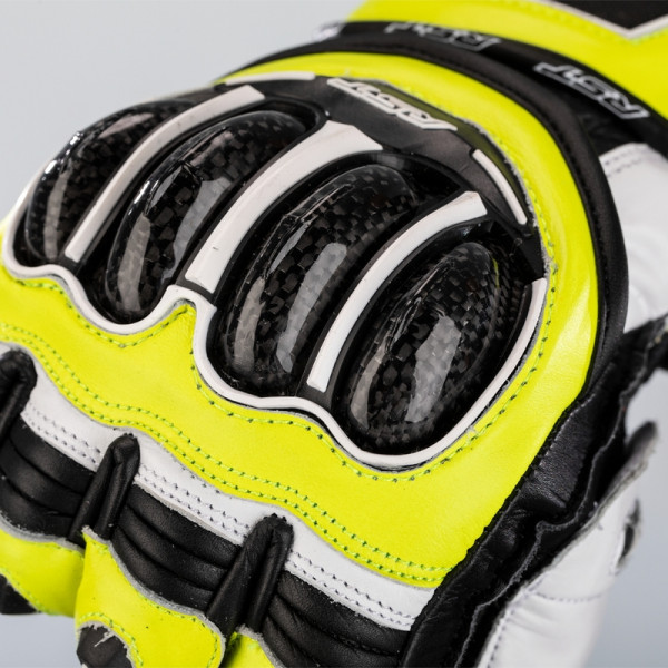 Fabriqué avec du Kevlar™ - Le gant TracTech Evo 4 combine le meilleur des précédents gants TracTech avec plus de caractéristiques pour un ajustement, un confort et une protection optimum.  Fabriqué en cuir de vachette pleine fleur et en cuir de kangourou, le gant est doté de protège-phalanges CE Niveau 2 en carbone pour la protection contre les chocs. Des fibres DuPont™ Kevlar sur les coutures et la sous-couche de la paume, ainsi qu'une double couche de cuir de kangourou et un slider de paume RST protègent la paume en cas de glissade à grande vitesse, tandis que la double fermeture de poignet et manchette offre un ajustement sûr. La doublure en DuPont™ Kevlar® sur tout le reste du gant permet d’éviter les déchirures, et le maintien auriculaire empêche le retournement des doigts sans affecter la préhension ou la souplesse lors du changement de vitesse. L'extérieur du gant est perforé pour maximiser la circulation de l'air, des coussinets en cuir sur la paume et les avant-doigts améliorent la préhension, une mousse à mémoire de forme sur le dos de la main favorise le confort et le soutien, et les doigts pré-courbés s'adaptent à la courbure de la main sur le guidon. Le gant TracTech Evo 4 n'offre aucun compromis - un gant de course haute performance pour les pilotes rapides.Homologation CE, 2 KPProtection  Protège-phalanges : Carbone CarboneProtection des doigts : Auriculaire accoléProtection du pouce : OuiSlider de paume : Oui  Fabrication  Matière principale externe : Cuir pleine fleurMatière secondaire externe : Cuir kangourouRenforcement : Fibre DuPont™ Kevlar®Doigts surpiqués : OuiDoigts pré-courbés : OuiFermeture manchette : Double fermeture de poignet à scratchVentilations : Cuir perforé Caractéristiques  Paume en cuir double couche : OuiSoufflets de doigts : Oui
