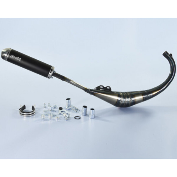 La caractéristique principale des pots d’échappement Evolution est la ligne avec passage bas qui a techniquement permis d’exploiter au mieux les dimensions des cônes d’expansion pour avoir les meilleures performances soit sur les moteurs d’origine, soit sur les moteurs préparés 80 cc, destinés uniquement aux compétitions.