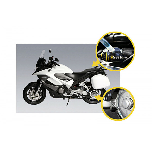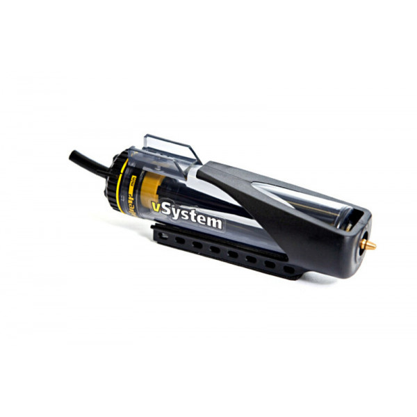 Le vSystem fonctionne par aspiration. Générée par le moteur en marche elle actionne la valve et permet à l’huile de s’écouler dans le tube d’alimentation jusqu’à la couronne. L’huile envoyée sur les maillons va se répandre par capillarité sur le reste de la chaîne. Avec un débit 1 goutte par minute, la pellicule d’huile ne viendra pas polluer la surface du pneu.