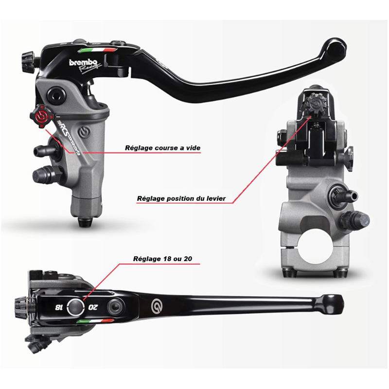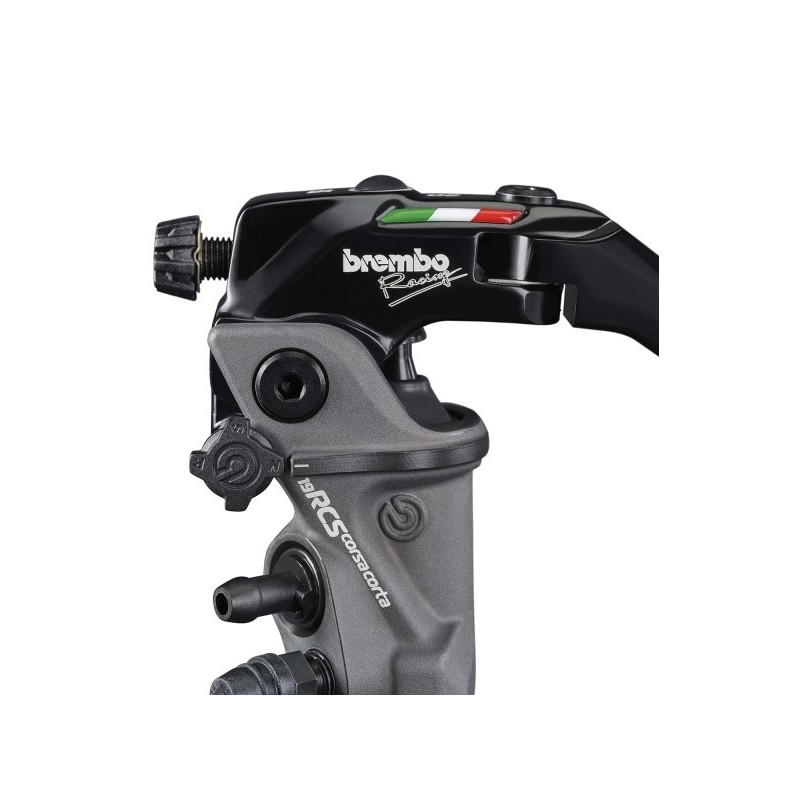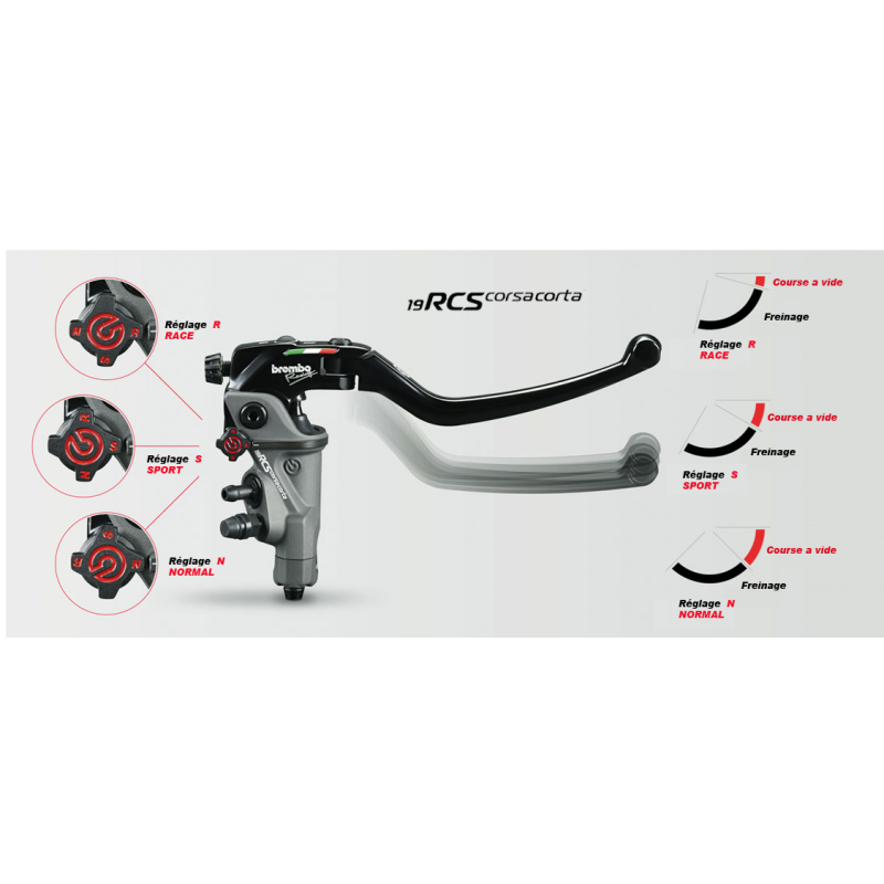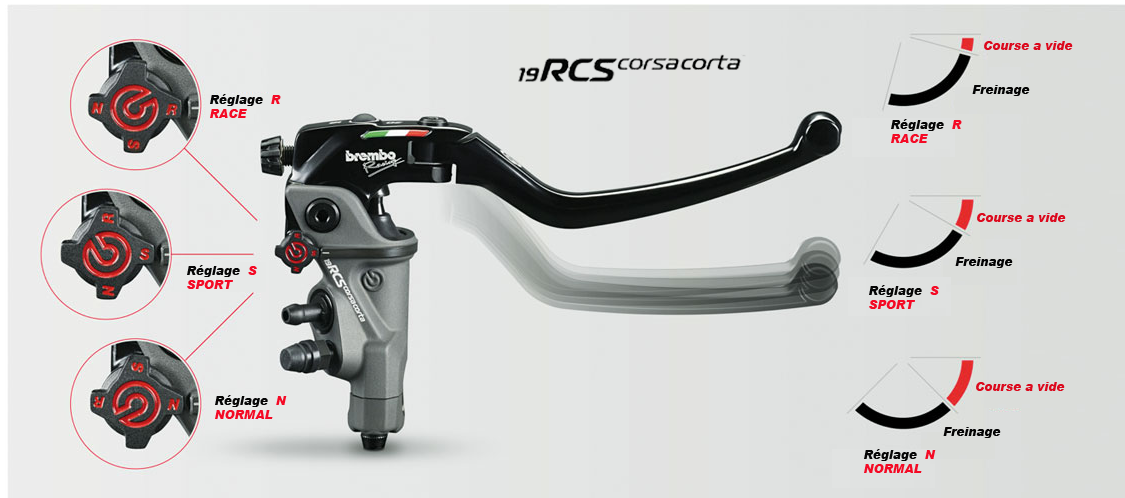 Le nouveau 19RCS CORSA CORTA de Brembo inclut également le système RCS (Ratio Click System). Introduit il y a 10 ans sur la pompe radiale Brembo 19RCS, il permet de régler l'entraxe de la pompe sur 18 ou 20, simplement en faisant pivoter de 180° la pièce de réglage présente sur le devant du levier de frein à l'aide d'un tournevis plat, avec un système de type excentrique (couleur rouge lorsqu'il est positionné sur 18 mm et noire sur 20 mm) qui déplace de 2 mm la distance entre l’axe du piston et le pivot de levier : le résultat est une distribution différente de la force de freinage sans qu'elle n'en soit pour autant affectée en termes de puissance même.
