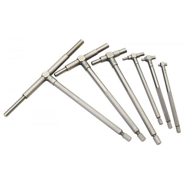 Jeu de 6 jauges télescopiques pour mesurer un alésage. Une fois la mesure figée, utiliser un micromètre pour lire la valeur.  Contenu: Jauge 8 à 13mm / Longueur 115mmJauge 13 à 19mm / Longueur 115mmJauge 19 à 31mm / Longueur 115mmJauge 31 à 54mm / Longueur 145mmJauge 54 à 89mm / Longueur 145mmJauge 89 à 150mm / Longueur 145mm