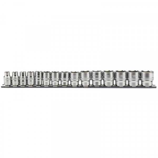 Douilles 3/8" 6 pans forgées à partir d’acier au chrome vanadium.  Finition satinée15 pièces livrées sur un rack métallique.Contenu: 8 - 9 - 10 - 11 - 12 - 13 - 14- 15 – 16 - 17 – 18 – 19 – 20 - 21 - 22mm