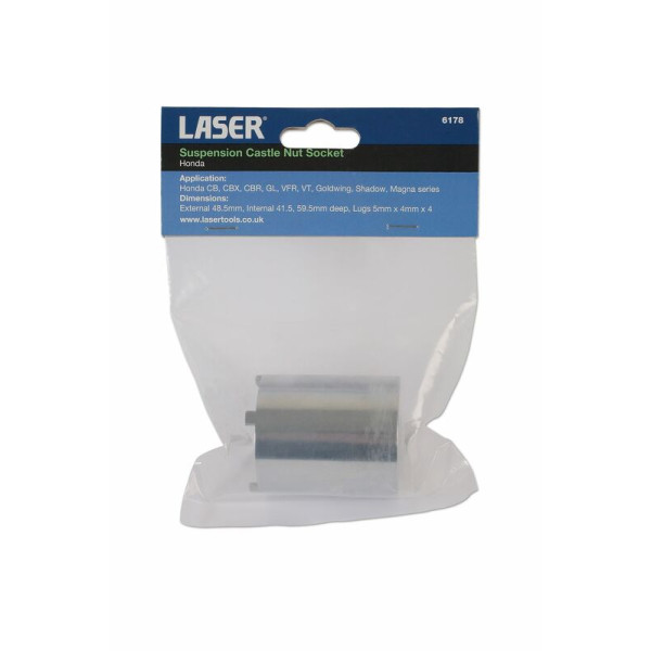 Les douilles à créneau sont toutes fabriquées en acier carboné moyen, traité à la chaleure puis chromé. Cela donne aux douilles une dureté et une résistance à la traction exceptionnelles et assure une longue durée de vie.   Conçu pour la colonne de directionFabrication en acier carboné moyen - Traité à la chaleur et platine en chromeDimensions: Externe 48.5mm, Interne 41.5mm, 59.5mm de profondeur, Crants 5mm x 4mm x 4Carré conducteur 1/2"Application: Honda CB/CBX/CBR/GL/VFR/VT/Goldwing/Shadow /Série Magna