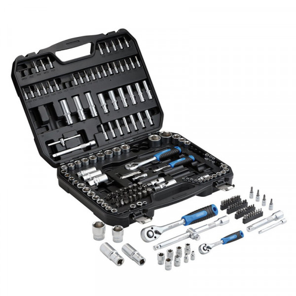 Ce coffret de douilles et d'embouts est fabriqué en acier au chrome vanadium avec une finition chrome satiné. Il comprend une large gamme de douilles HI-TORQ®de 1/4", 3/8" et 1/2", 6 pans ainsi que des douilles longues. Les cliquets à dégagement rapide à 72 dents sont équipés de poignées souples pour plus de confort. Le coffret comprend également des Rallong, une barre en T coulissante, des bougies d'allumage, des joints universels et bien plus encore. De plus, il contient une large gamme d'embouts à douille en acier au chrome vanadium avec finition grenaillée. Tous ces articles sont fournis dans un coffret robuste en matière plastique.