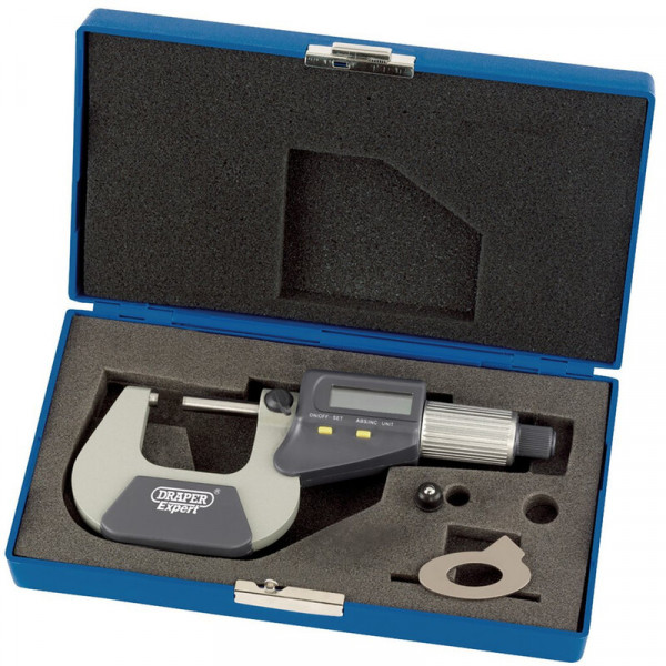 Qualité Expert, avec cadre émaillé, plaques chauffantes, cosse et manchon chrome satiné. Enclumes de mesure en carbure, serrure et butée à cliquet. Graduations 0,001 mm et 0,0005". Extrémités parfaitement plates pour des mesures précises. Livré avec Batterie SR44. dans étui de rangement en plastique.