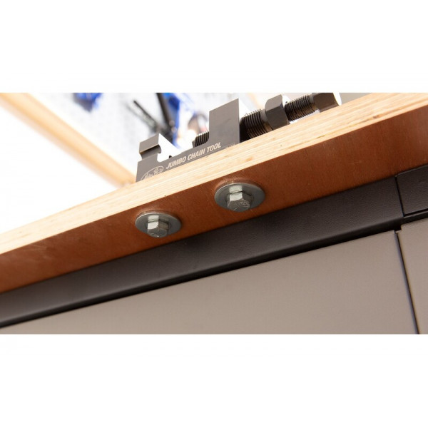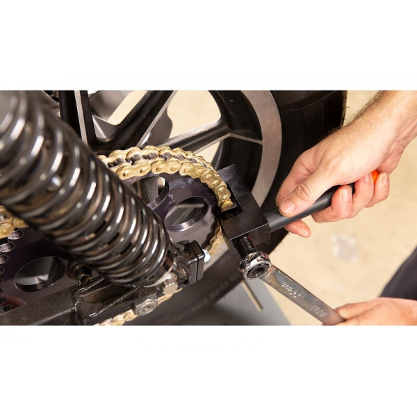 Outil professionnel indispensable pour le remplacement d'une chaîne de transmission secondaire.  Equipé d'un kit de rivetage pour axe creux (rivetage par écartement)Kit de rivetage axe plein en optionCapacité : 520 à 630  Accessoires en option :  Kit rivetage axe plein (carré) réf : 890364Kit rivetage axe creux réf : 893249  Pièces de rechange :   Pointeau de dérivetage réf : 890361Embout rivetage axe creux réf : 890360-1Plaque d'assemblage réf : 8903603Butée rivetage axe creux réf : 890360-2