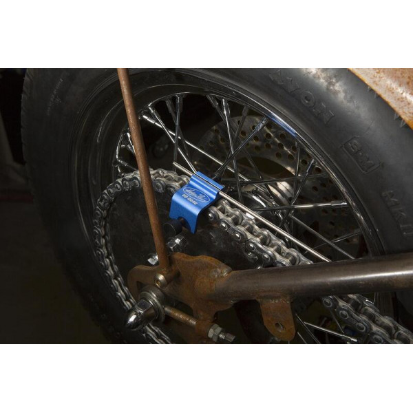 Outil de contrôle rapide et précis de l'alignement de chaîne de transmission permettant ainsi de vérifier le bon centrage de la roue arrière. Le boîtier se fixe sur la chaîne au niveau de la couronne. La tige en direction du pignon de boîte indique l'alignement de la chaîne et donc si la roue arrière est centrée ou non.