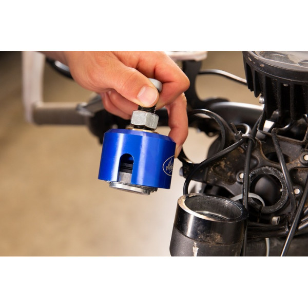 • Conçu pour retirer la bague de roulement supérieure de la tête de direction sans utiliser de marteau ni de poinçon.