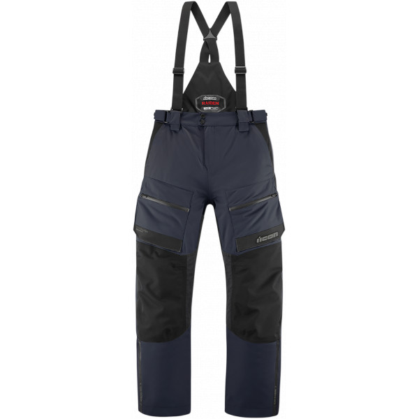 Enveloppe en nylon triple couche Dupontª avec respirabilité imperméable 10k/10k et renforts durables en Cordura¨, Le pantalon ICON Raidenª est doté de coutures totalement imperméables et de zips YKK¨ étanches sur toute la longueur de la jambe, Kit complet de protections D3O¨ - couverture des hanches et des genoux (3 positions), Poches de rangement cargo, passants de ceinture, grand scratch technique, réglage au bas de la jambe avec un système de gouttière imperméable et éléments réfléchissants