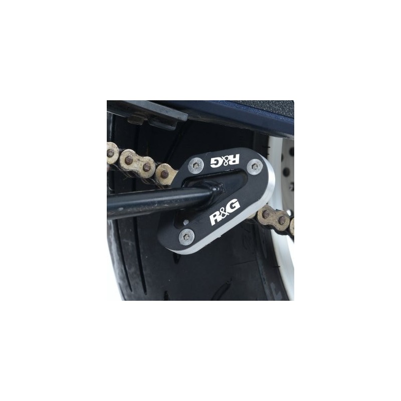 Les patins de béquille R&G Racing se vissent sur votre béquille d’origine et doublent la surface d’appui, pour éviter l’enfoncement dans le sol. Malgré sa taille plus importante, la garde au sol et la ligne de chaine ne sont pas affectées dans des conditions normales de conduite.