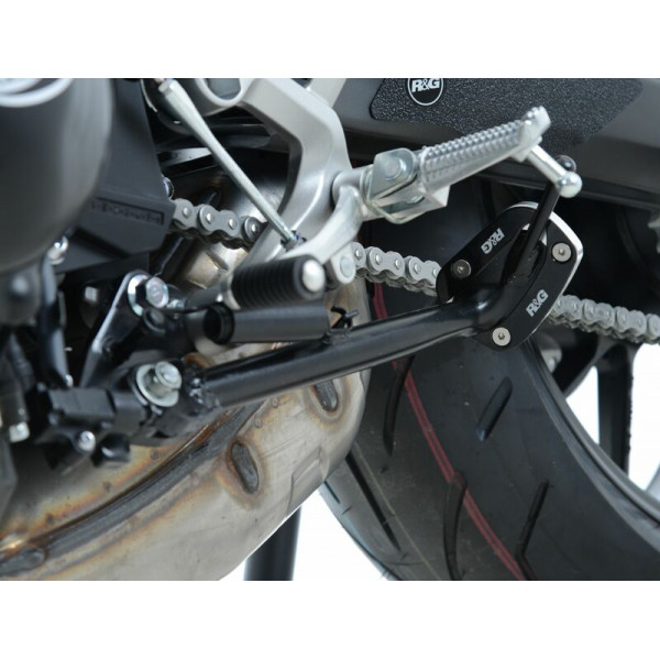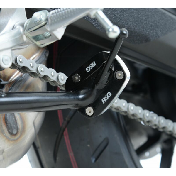 Les patins de béquille R&G Racing se vissent sur votre béquille d’origine et doublent la surface d’appui, pour éviter l’enfoncement dans le sol. Malgré sa taille plus importante, la garde au sol et la ligne de chaine ne sont pas affectées dans des conditions normales de conduite.  Fixation par pincement de la plateforme de la béquillePatin fabriqué sur mesure pour chaque véhiculePartie basse en aluminium – partie supérieure en inoxMontage facile et rapide