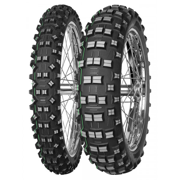 Mitas TERRA FORCE-EF Super, repéré d'un marquage jaune, dispose d'un composé durable assurant un grip exceptionnel et peu d'abrasion même sur les terrains durs. Résiste aux déchirures et coupures, et est de ce fait adapté à une large plage d'utilisation, allant du soft à l'intermédiaire, jusqu'au rocailleux.  Mitas TERRA FORCE-EF Super light, repéré d'un marquage vert, conçu pour l'enduro extreme. Comparé à la version "Super", il dispose d'un composé de gomme plus tendre, lui assurant une meilleure adhérance sur terrains durs et rocailleux ainsi qu'en forêt humide sur racines. Les TERRA FORCE-EF Super et Super light respectent les normes de la Fédération Internationale de Motocyclisme (FIM)  Marquage jaune - pneus avec un composé plus souple appropriés pour l’enduro FIM et la compétition de cross-country  Marquage vert - pneu à carcasse plus souple et bande de roulement souple approprié pour les compétitions de hard enduro