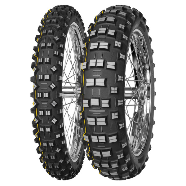 Mitas TERRA FORCE-EF Super light, repéré d'un marquage vert, conçu pour l'enduro extreme. Comparé à la version "Super", il dispose d'un composé de gomme plus tendre, lui assurant une meilleure adhérance sur terrains durs et rocailleux ainsi qu'en forêt humide sur racines. Les TERRA FORCE-EF Super et Super light respectent les normes de la Fédération Internationale de Motocyclisme (FIM)