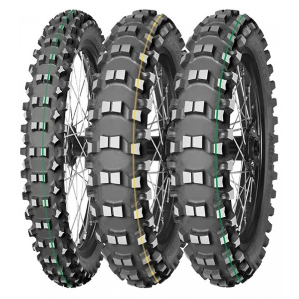 Super Light (Technical Enduro) identifié par la bande verte caractéristique : carcasse légère et composé tendre et gommeux, spécialement conçu pour l'Enduro technique, idéal sur terrains humides et glissants.
