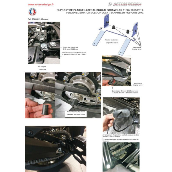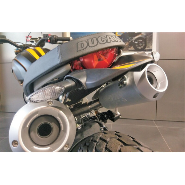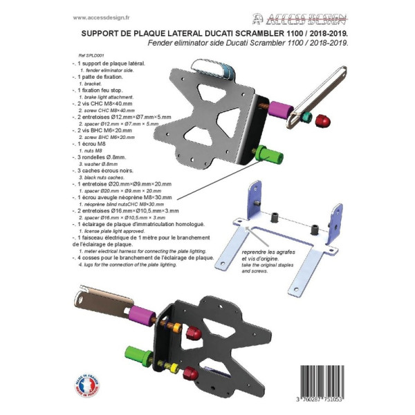 Le support de plaque latéral pour Ducati Scrambler 1100 est conçu en deux éléments, pour pouvoir permettant le réglage de son inclinaison. Fait d’acier de 3mm d’épaisseur, il ne vibrera pas, et est revêtue d’une peinture époxy noire.Placé sur l’axe de roue arrière Il se place sur la surface plane de la tête hexagonale de l'axe de roue arrière.Fixé par insert néoprène qui se gonfle au serrage. Un insert fileté M8 en néoprène vient se loger dans le diamètre de l'axe de roue, au serrage du support de plaque l'insert se gonflera au serrage.La patte renforcée vient se fixer sur la fixation du carter de chaîne qui maintiendra le support de plaque latéral en plus d'être fixé sur l'axe de roue.Eclairage à LED norme CE inclus, position haute ou basse au choix Il est fourni avec un éclairage de plaque à LED norme CE et d'un faisceau électrique de 1 mètre pour effectuer le raccordement de l'éclairage à votre faisceau électrique d'origine.Vous avez la possibilité, soit de mettre votre éclairage de plaque en haut ou en bas ; dans les deux cas la plaque d'immatriculation va recouvrir l'ensemble de votre support de plaque.Clignotants, feux arrière et visserie d’origine, conservant l’allure de votre ScramblerLa pièce de remplacement de votre support de plaque d'origine est étudié pour garder les lignes fluides de votre Scrambler. Vous pouvez garder vos clignotants d'origine ainsi que la visserie, elle s'ajustera parfaitement avec votre feu arrière.Compatible avec toutes les plaques d’immatriculations. Toutes les plaques d'immatriculation françaises et internationales peuvent se monter sur le support de plaque latéral.