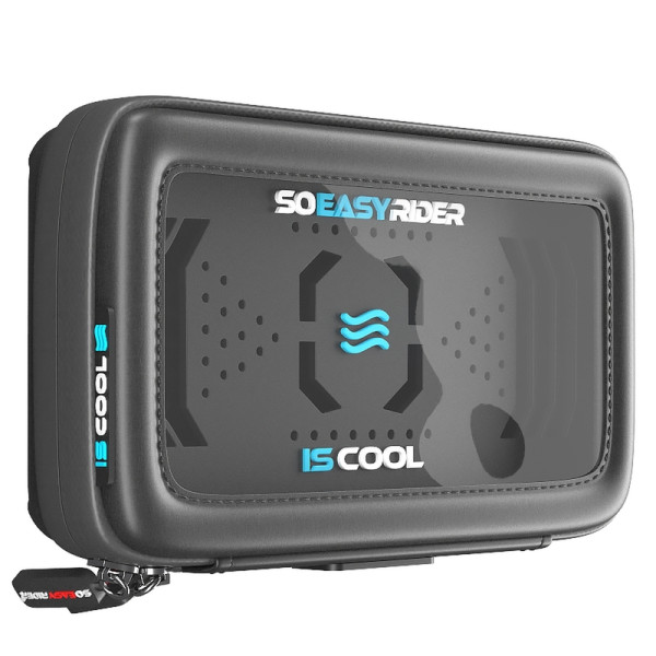 INNOVATION 2019 Housse seulement, attaches guidon non incluses. L'utilisateur a le libre choix de son attache guidon (Ram Mount ou So Easy Rider) Protège la batterie du smartphone tout en le maintenant à la bonne temperature de fonctionnement jusqu’à 40°C grâce à son système de ventilation intégré.  Sousse SO EASY RIDER, compatible avec toutes les tailles de smartphone. Durant l’été, les smartphones sont exposés aux rayons ultra violet du soleil. Ces rayons créent une accumulation de chaleur et de gaz dans la batterie du smartphone. Dans certains cas extrême, le smartphone ne peut plus fonctionner et affiche un message demandant à l'utilisateur de reffroidir son appareil pour pouvoir continuer à l'utiliser.La batterie s’use prématurément et peut causer des dommages irréparables. IS COOL permet à la batterie de maintenir la bonne temperature de fonctionnement et de preserver la vie du téléphone. Un flux d’air constant est généré par 2 puissants ventilateurs. Un ventilateur fait entrer de l’air frais à l’intérieur et le second expulse l’air stagnant. Un veritable vortex est créé et le smartphone ne peut pas surchauffer. SO EASY RIDER QI est connecté en permanence au chargeur USB fourni. Bon à savoir : Toute la gamme SO EASY RIDER est compatible avec les produits RAM MOUNTS.